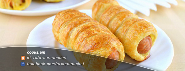 - Ըստ ցանկության կարելի է նրբերշիկների վրա երկայնական կտրվածք անել և լցոնել քերած պանրով, որից հետո փաթաթել շերտավոր խմորի մեջ:
