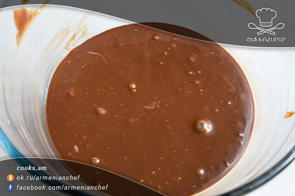 Շոկոլադը մանր կտրատում ենք։ Սերուցքը հասցնում ենք եռման աստիճանի և շոկոլադը լցնում ենք մեջը։ Խառնիչով խառնում ենք մինչև համասեռ զանգված ստանանք։