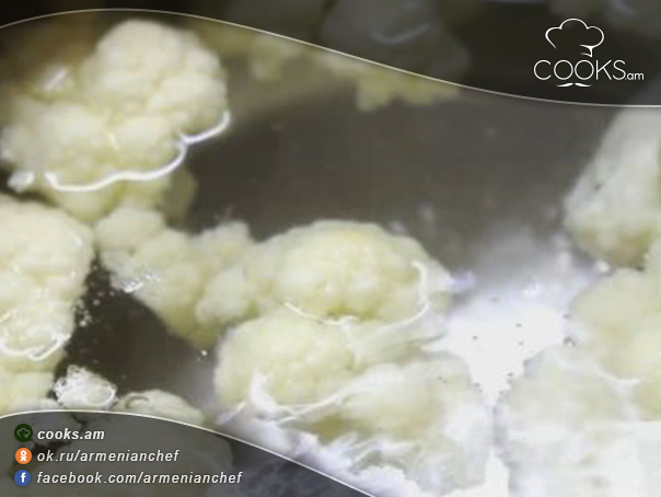 - Կիտրոնի շերտը գցում ենք աղաջրի մեջ, ապա ավելացնում ենք ծաղկակաղամբն ու 5 րոպե շոգեխաշում եռացրած ջրի մեջ։