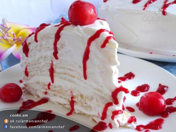 - Նրբաշերտը դնում ենք ափսեի մեջ ու սերուցքապատում: Իրար վրա ենք դասավորում բոլոր նրբաշերտերը՝ յուրաքանչյուրի վրա սերուցք քսելով: Նրբաշերտերից պատրաստված տորթը 1 ժամ թողնում ենք սառնարանում: