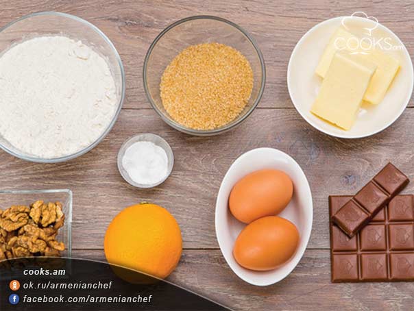 - Ալյուրը խառնում ենք փխրեցուցիչի հետ, ավելացնում ենք մանրացրած ընկույզը, շոկոլադը, նարնջի կեղևը, ձուն, աղը և խառնում ենք: