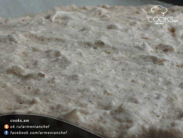 - Յուղաթղթի վրա զգուշորեն լցնում ենք բեզեն ու եփում ենք 120-130 րոպե 160 աստիճան ջերմությամբ: Պետք է ստացվի ոչ շատ չոր շերտ: Նույն ձևով պատրաստում ենք մյուս երկու շերտերը: