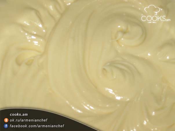 - Տորթը կազմված է 3 սպիտակուցային շերտից: Առաջին շերտի համար ձվի 2 սպիտակուցը հարում ենք՝ կամաց-կամաց ավելացնելով 100 գր շաքարավազը: