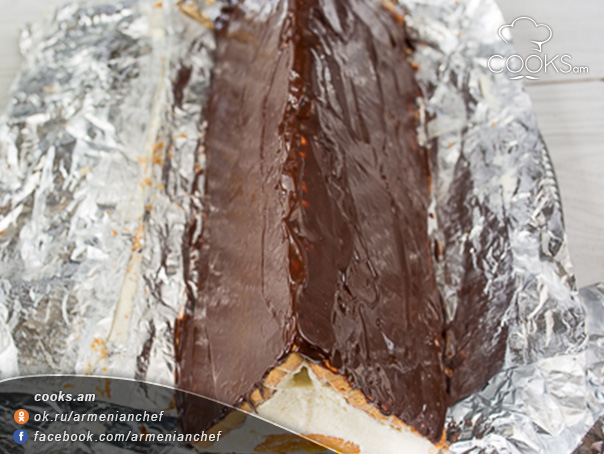 - Թխվածքաբլիթներով տնակը դուրս ենք բերում սառնարանից և պատում ենք գանաշով։