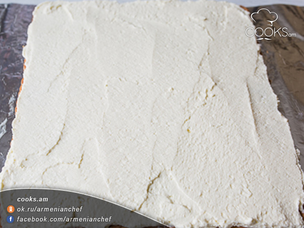 - Թխվածքաբլիթները դասավորում ենք փայլաթիթեղի վրա երեք շարքով, ապա վրան հավասարապես տարածում ենք կաթնաշոռային կրեմը։