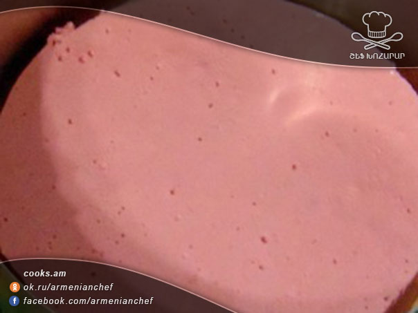 - Այնուհետև սերուցքն ազնվամորիով մուսսի հետ խառնիչով խառնում ենք և տեղափոխում 14 սմ տրամագծով ձևամանի մեջ, որից հետո տեղափոխում ենք սառցախցիկի մեջ, որպեսզի պնդանա։