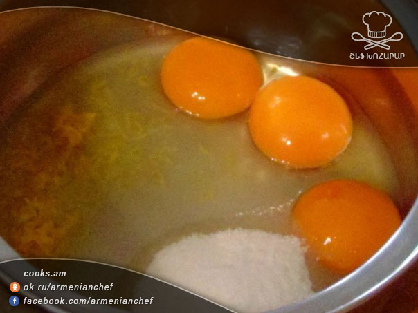 - Ջեռոցը մինչև 180 աստիճան տաքացնում ենք։ Յուղաթղթի վրա կարագ ենք քսում և դնում տապակի մեջ։ Յուղաթղթի վրա ենք դնում (առանց ներքևի հատվածի) 16 սմ տրամագծով ձևամանը։ Ձուն շաքարավազի հետ հարում ենք մինչև փքուն զանգված ստանանք։