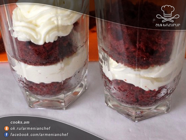 - Սկսում ենք հավաքել աղանդերը: Բաժակների կամ թափանցիկ գավաթների մեջ շերտ-շերտ դնում ենք բիսկվիթն ու կրեմը: