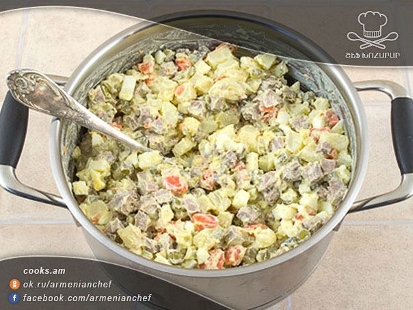 - Աղ ենք անում, մայոնեզ կամ թթվասեր լցնում` ըստ ճաշակի, և լավ խառնում։