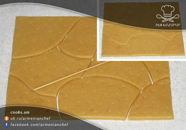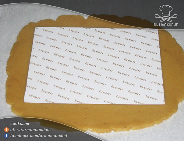 Սառեցրած խմորը յուղաթղթի վրա ոչ հաստ շերտով բացում ենք։ Վրան դնում ենք նախապես կտրած ուղղահայաց թուղթը և խմորի ավելցուկները հեռացնում։