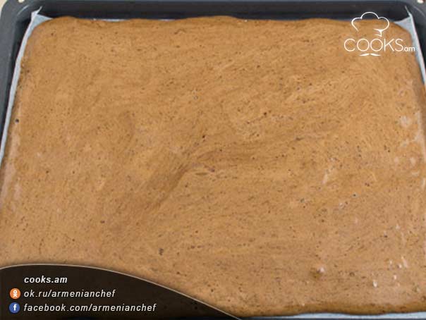 - Խմորը լցնում ենք յուղաթղթապատ ձևամանի մեջ և եփում ենք 15- 30 րոպե 200 աստիճան տաքացրած ջեռոցում: