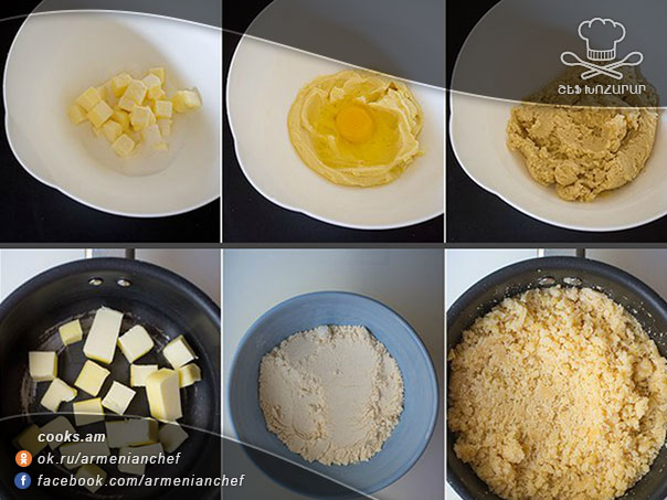 Պատրաստում ենք խմորը: Կարագը մանր կտրատում ենք, խառնում շաքարի փոշու հետ և փայտե թիակով տրորում մինչև համասեռ զանգված ստանալը: Հետո հերթով ավելացնում ենք մյուս բաղադրիչները՝ յուրաքանչյուրն ավելացնելուց հետո խմորը լավ խառնելով: