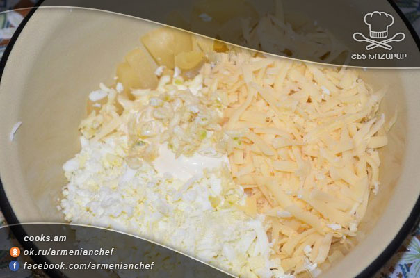 - Ամանի մեջ ենք լցնում անանասը, ձուն, պանիրը, մանրացրած սխտորը, ըստ ճաշակի աղ անում և մայոնեզով կամ թթվասերով համեմում։