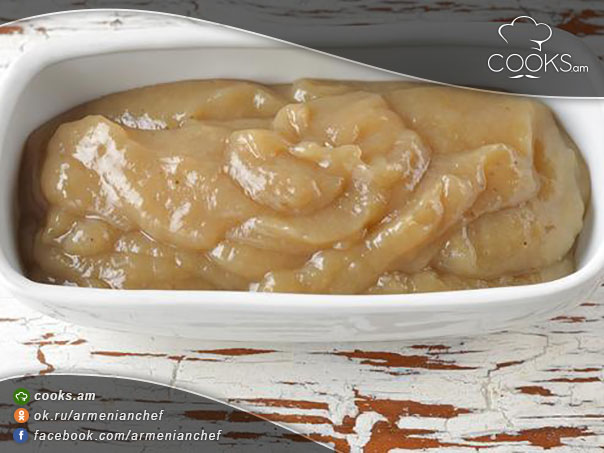 - Ջուրը, շաքարավազը, կիտրոնի աղն ու մեղրը լցնում ենք կաթսայի մեջ և մարմանդ կրակին անընդհատ խառնելով եփում: Բանանը կտրատում ենք, լցնում զանգվածի մեջ և 10 րոպե անընդհատ խառնելով համասեռ զանգված ստանում: