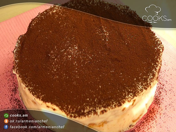 - Այս ամենից հետո կրկին շարում ենք սուրճի մեջ թաթախած թծվածքաբլիթները, վրան կրեմ ենք լցնում և տորթը 2-4 ժամով տեղափոխում ենք սառնարան: