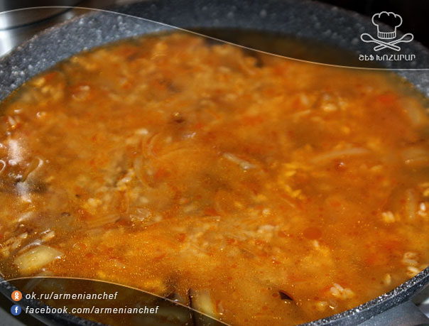 - Թողնում ենք բրինձը թեթևակի ներծծվի յուղով, ապա լցնում եռացրած ջուրը այնքան, որ լինի բրնձից 1սմ բարձրության վրա: