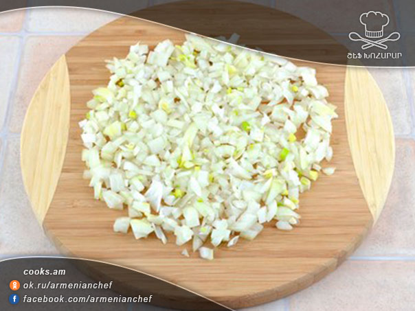 - Սոխը մաքրում ենք և մանր կտրատում։