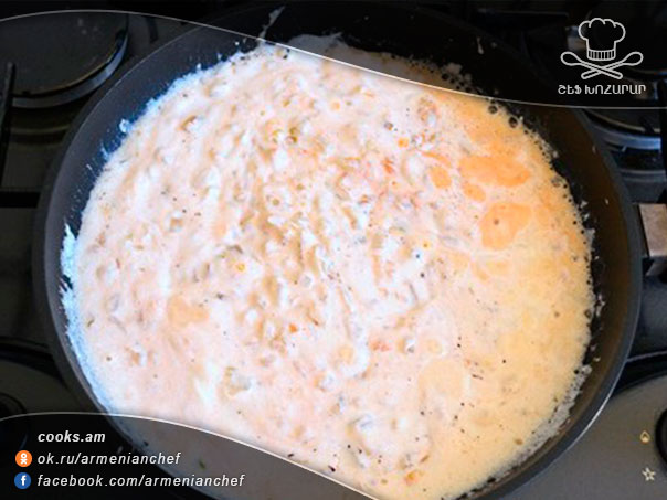 - Բուսայուղը լցնում ենք թավայի մեջ, ավելացնում ենք սոխը և տապակում մինչև դառնա թափանցիկ։ Ավելացնում ենք ալյուրն ու խառնում ենք։ Այժմ լցնում ենք թթվասերը, լոլիկի սոուսը, ինչպես նաև աղ ու պղպեղ ենք անում։ Մոտ 0,5 բաժակ ջուր ենք լցնում, խառնում և հասցնում եռման աստիճանի։