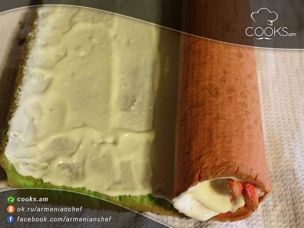 - Կարմիր մասից սկսած՝ ռուլետի նման փաթաթում ենք սրբիչի հետ միասին և թողնում հովանա: