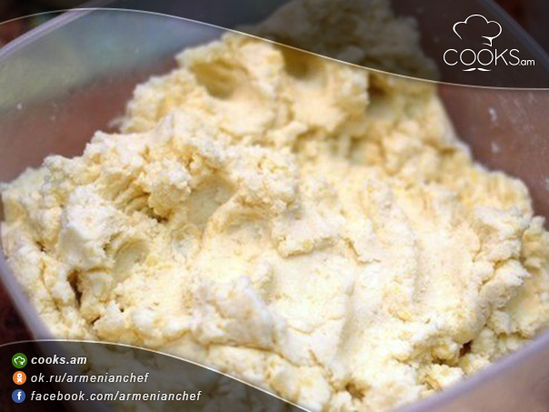 - Կարտոֆիլն ու պանիրը խառնում ենք և մսաղացով աղում: Խմորից ու միջուկից հավասարաչափ գնդիկներ ենք ձևավորում, խմորը բլիթի նման տափակացնում, կենտրոնում դնում միջուկի գնդիկը և խմորով փաթաթում ենք: