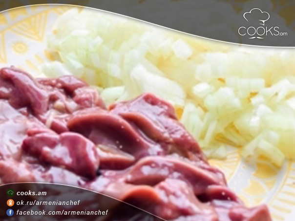 - Հավի լյարդը բաժանում ենք կտորների։ Սոխը մանր կտրատում ենք։