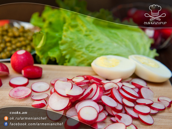 - Բողկն ու ձուն օղակաձև բարակ կտրատում ենք: