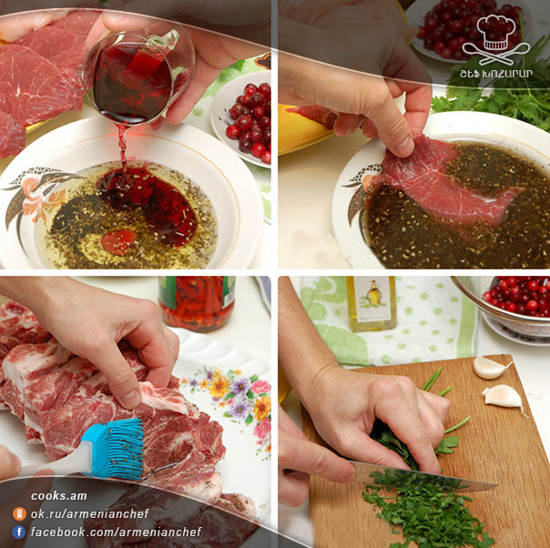 Տավարի մսի կտորներն ու հավի ֆիլեի կտորները թաթախում ենք այդ խառնուրդի մեջ, իսկ խոզի մսի շերտերը բոլոր կողմերից ենք թաթախում։