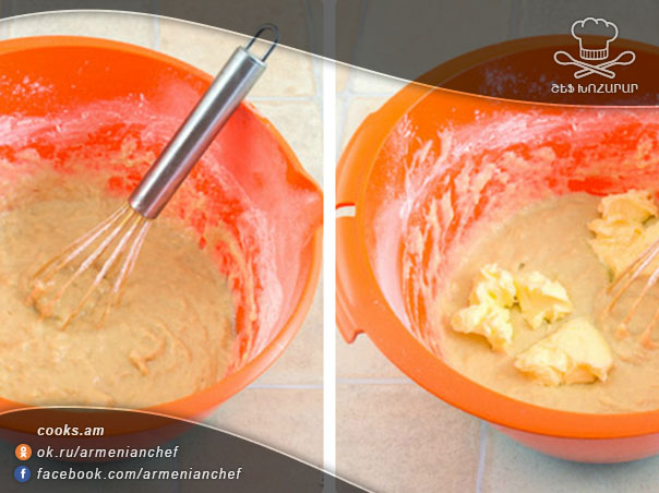 Ավելացնում ենք փափկեցրած կարագը և այնքան ենք խառնում մինչև համասեռ զանգված ստանանք։