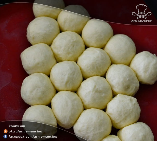 - Պատրաստի խմորը բաժանում ենք 19 գնդի, ապա շարում ենք այդ գնդերը տոնածառի տեսքով պերգամենտային թղթով պատած տապակի վրա: