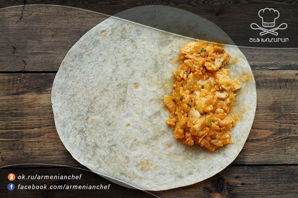 - Տորտիլյայի լավաշի ծայրի վրա լցրեք 3-4 գդալ պատրաստված միջուկից: