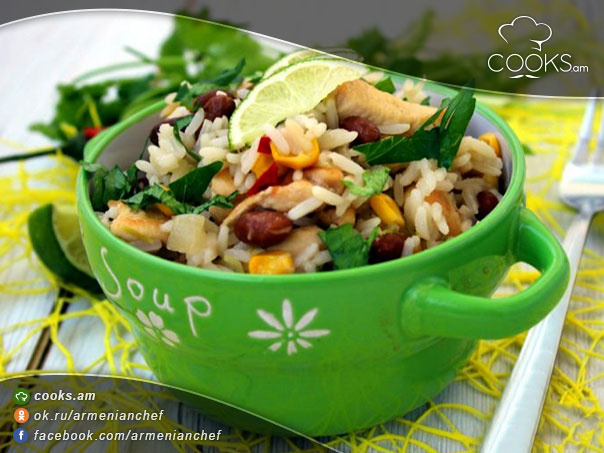 Վերջում լցնում ենք լոբին, հավի ֆիլեն ու եգիպտացորենը: