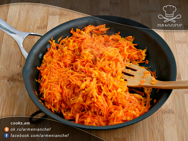 - Բուսայուղը, գազարն ու խնձորը լցնում ենք տաքացրած տապակի մեջ և ուժեղ կրակին, անընդհատ խառնելով եփում, այնուհետև կրակի տակն իջեցնում ենք և ծածկում կափարիչով: