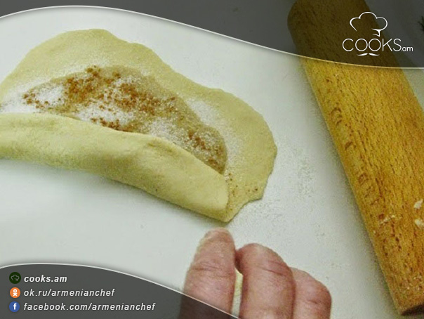 - 1 բաժակ շաքարավազն ու 0,5 բաժակ դարչինը լցնում ենք բլենդերի մեջ, ավելացնում ենք մի քիչ ջուր։ Միջուկը պետք է լինի պինդ ու կրեմանման։ Միջուկը լցնում ենք խմորաշերտի վրա ու տարածում, որից հետո վրան շաղ ենք տալիս դարչինն ու շաքարավազը։