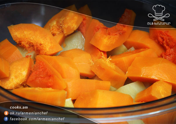 - Կարտոֆիլն ու դդումը մաքրում ենք, մեծ կտորներով կտրատում և եփում (շոգեեփ սարքի մեջ 30 րոպե է տևում)։