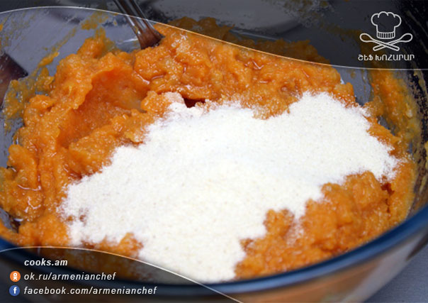 - Դդումն ու կարտոֆիլը խյուսի ենք վերածում, ավելացնում ենք 50մլ բուսայուղը և