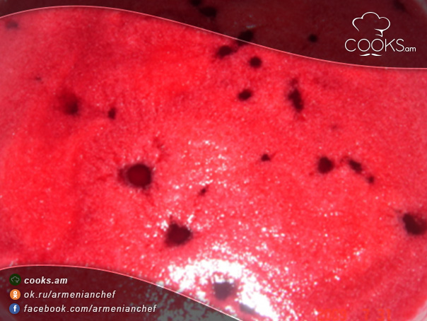 - Ստացված զանգվածին ավելացնում ենք շաքարավազը, դնում ենք կրակի վրա ու հասցնում ենք եռման աստիճանի։ 15-20 րոպե եփելուց հետո հանում ենք կրակի վրայից և փրփուրը հեռացնում ենք։