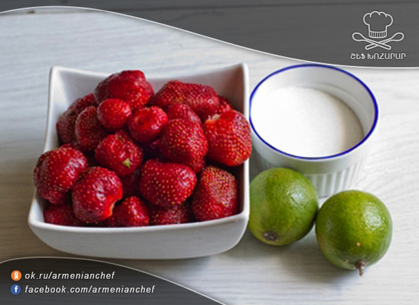 - Բլենդերում հարում ենք լայմը, ելակի խյուսը և ջուրը, ապա տեղափոխում սառնարան փոքր-ինչ սառչելու: