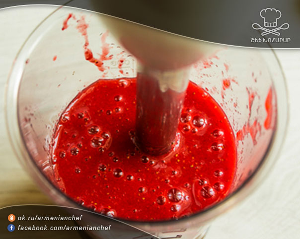 - Բլենդերում պյուրեի ենք վերածում ելակը, ապա ավելացնում շաքարավազը: