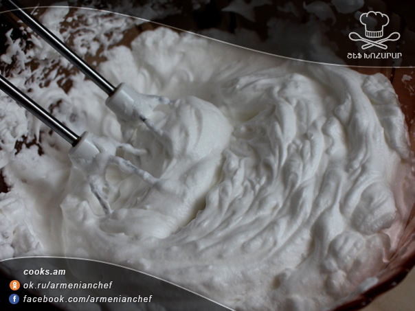 - Սպիտակուցները հարում ենք մինչև պինդ փրփուր ստանանք, այնուհետև ավելացնում ենք 50 գր շաքարավազն ու շարունակում հարել, մինչև զանգվածը խտանա և փայլի: