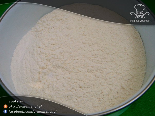 - 100 գր մանրացված շաքարավազն ու ալյուրը միասին մաղում ենք:
