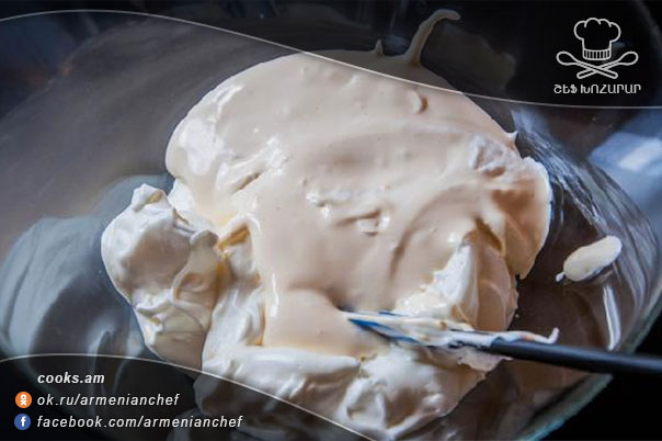 - Սպիտակուցները առանձնացնում ենք դեղնուցներից, ապա սպիտակուցները հարիչով հարում ենք այնքան մինչև փրփրանման սպիտակ զանգված ստանանք, այնուհետև գդալ առ գդալ ավելացնում ենք շաքարավազի հետ խառնած կիտրոնի կեղևը։