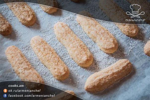 - Թխում ենք 12 րոպե 180 աստիճան տաքացրած ջեռոցում։ Սավոյարդին պետք է ոսկեգույն դառնա։ Եթե թխվածքաբլիթը յուղաթղթից առանձնացնելիս, ներքևի հատվածը հեշտ է առանձնանում և հարթ է մնում, ուրեմն արդեն պատրաստ է։