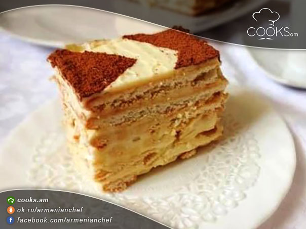 - Մատուցվող ամանի մեջ 2 շարքով շարում ենք թխվածքաբլիթները և կրեմ քսում: Այնուհետև կրկին շարում ենք թխվածքաբլիթներ և վրան կրեմ քսում: Գործողությունը կրկնում ենք այնքան, մինչև կրեմն ու թխվածքաբլիթները վերջանան: Վերջին շերտին կրեմ ենք քսում և 15 րոպեով տեղափոխում սառնարան: Ժամանակը լրանալուն պես տորթը հանում ենք սառնարանից, վրան կակաո ցանում և մատուցում: