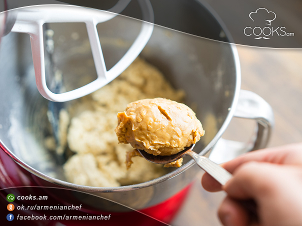 - Կրեմն արդեն կարելի է օգտագործել: Այն ջրիկ է, բայց չի հալչում: Լցնում ենք կլոր գլխադրով խոհարարական պարկի մեջ և քսում թխվածքաբլիթի վրա: Կենտրոնում կարող ենք դնել գետնանուշի հատիկներ, կարամել, մուրաբա, ջեմ և այլն: