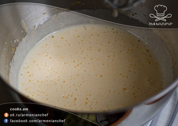 - Ձվերը շաքարավազի և վանիլինի հետ հարում ենք մինչև փքուն սպիտակ զանգված ստանանք։