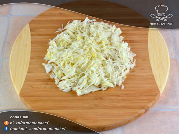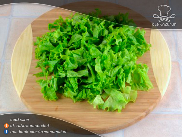 - Հազարի թերթերը լվանում ենք, սրբիչով չորացնում և բավական խոշոր կտորներով կտրատում (կարող ենք ձեռքերով մանրացնել)։