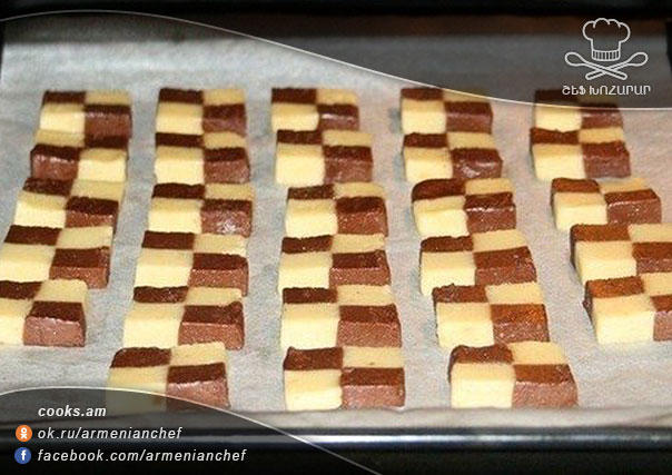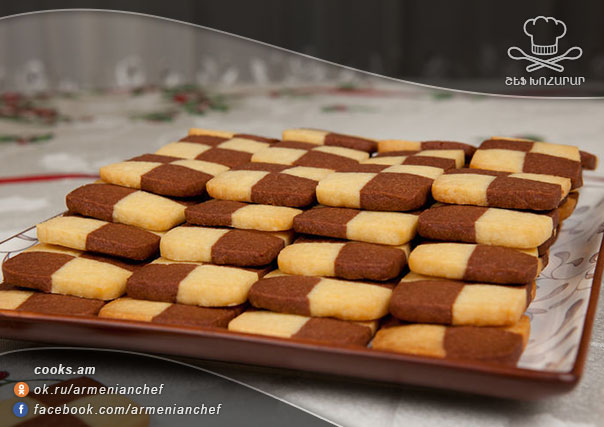 - Ձվերը պինդ եփում ենք, մաքրում, սպիտակուցները դեղնուցներից առանձնացնում ենք (տվյալ բաղադրատոմսում սպիտակուցները մեզ պետք չեն գալու)։ Պինդ եփված դեղնուցները պատառաքաղով ճզմում ենք։ Փափկեցրած կարագը շաքարավազի, աղի, վանիլինի և դեղնուցների հետ խառնում ենք։ Այնուհետև ավելացնում ենք ալյուր և խմոր հունցում։ Զանգվածը 2 մասի ենք բաժանում։ Մի մասի մեջ կակաո ենք ավելացնում և խառնում։ Բաց և մուգ գույնի խմորները նույն չափով գրտնակում ենք (14x9)։