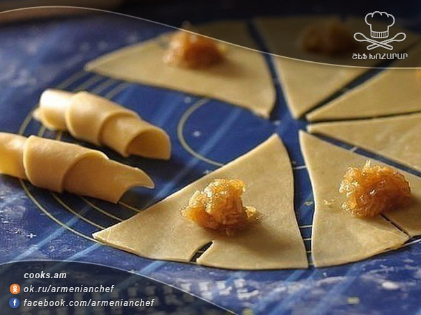 - Կարագը գոլորշու վրա թեթևակի հալեցնում ենք։ Այնուհետև ավելացնում ենք շաքարավազը, դեղնուցները, թթվասերը և խառնում ենք։ Աստիճանաբար ալյուր ավելացնելով խմոր ենք հունցում։ Խմորը 3 մասի ենք բաժանում և 30 րոպեով տեղափոխում ենք սառնարանը։ Յուրաքանչյուր մասը 30 սմ տրամագծով և 2-3 մմ հաստությամբ շրջանաձև գրտնակում ենք։ Շրջանը 8 հավասար հատվածների ենք կիսում, կամ էլ եթե ցանկանում ենք թխվածքները փոքր լինեն` 12 մասի ենք բաժանում։ Յուրաքանչյուր կտորի լայն մասի վրա մուրաբա ենք լցնում և փաթաթում ենք։