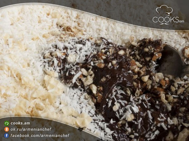 - Վաֆլիի փշրանքները, կոկոսի քերուկը ու մանրացրած ընկույզները լավ խառնում ենք, ավելացնում ենք շոկոլադե զանգվածը և կրկին խառնում: