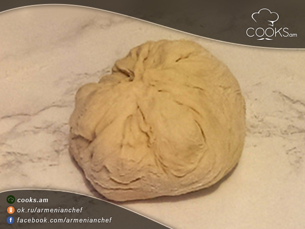 - Ձեռքերով տրորում ենք ու բացում միջին չափի խմորաշերտ։